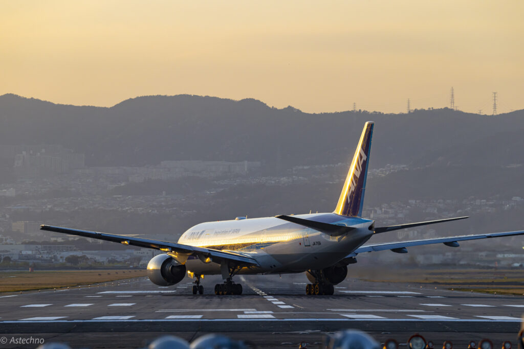 日没後の残照が機体に反射。飛行機が一番輝く瞬間。